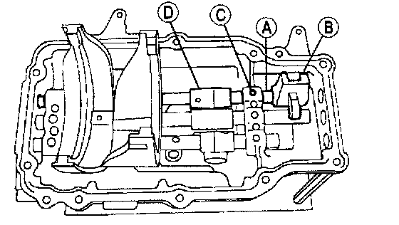 6. Position the (B) fifth/reverse shift control, the (C) detent ball and spring and the (D) shift gate and install the (A) fifth/reverse shift rail.