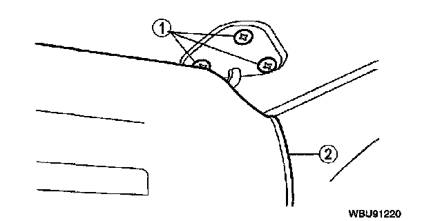 6. Remove molding (1) and windshield (2). Refer to Windshield Removal Note.