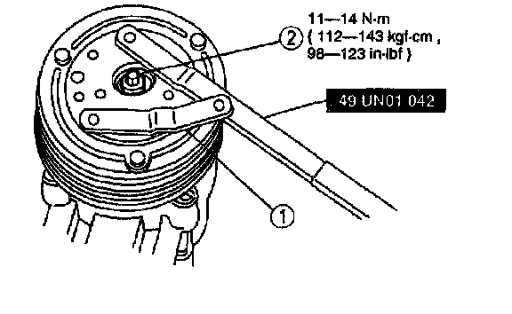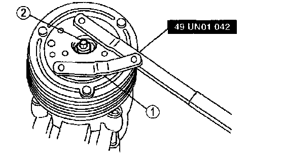 1. Hold the A/C clutch hub with the Spanner Wrench SST 49-UN-1-042.