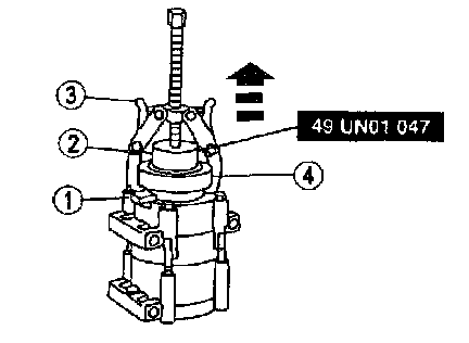 3. Install a 2-jaw puller on the compressor with tip of the puller forcing screw in the center pilot. Place the jaws of the puller around the back edge of the field coil. Tighten the puller forcing screw to pull coil from compressor.