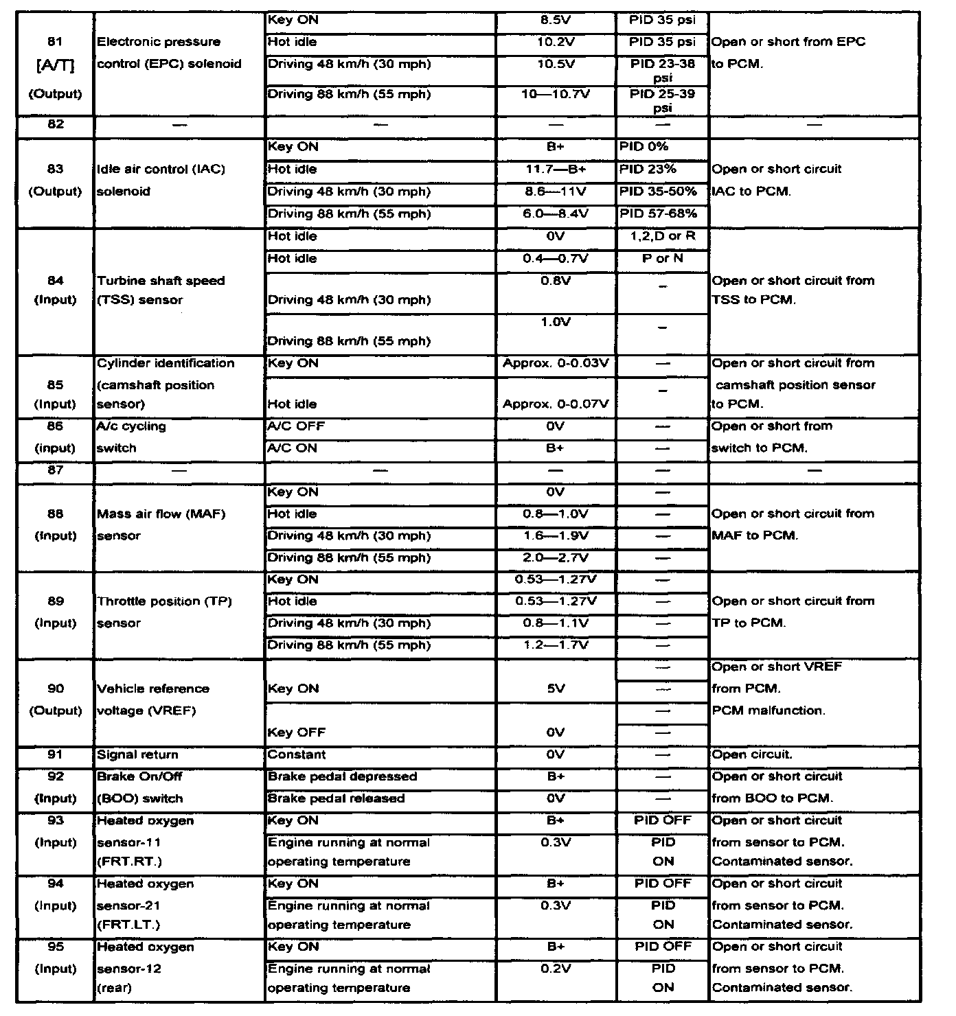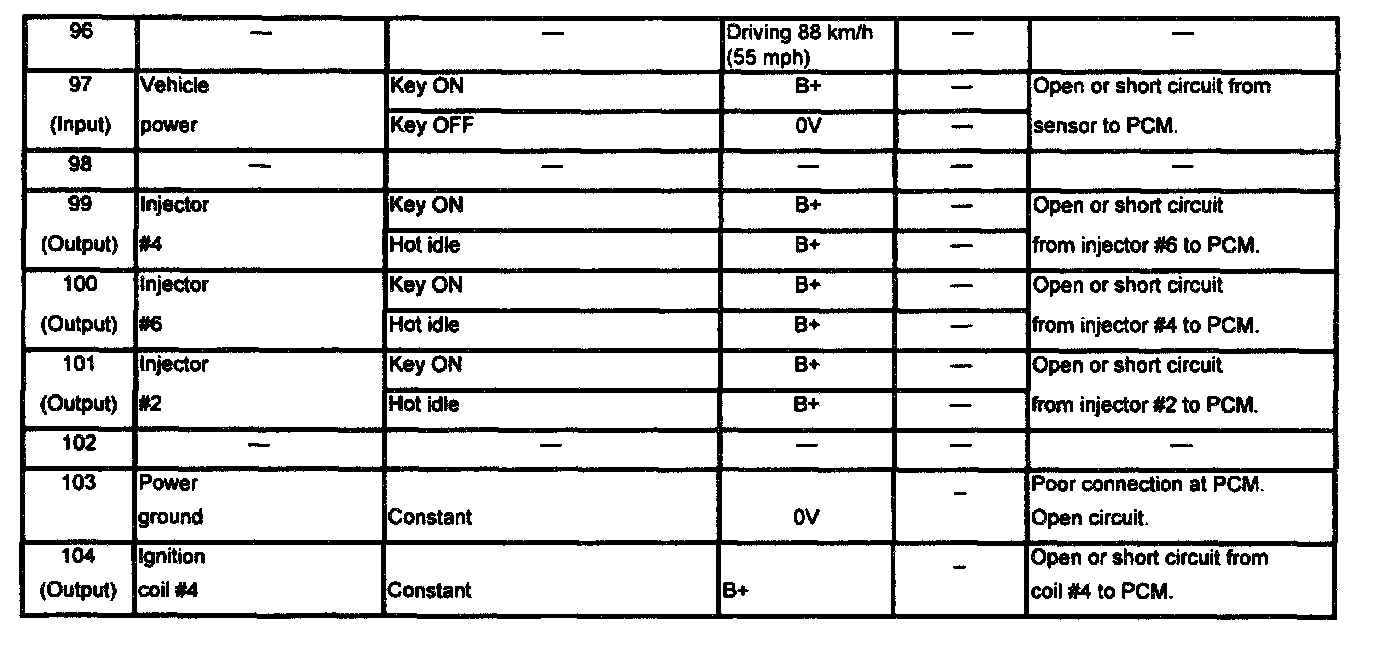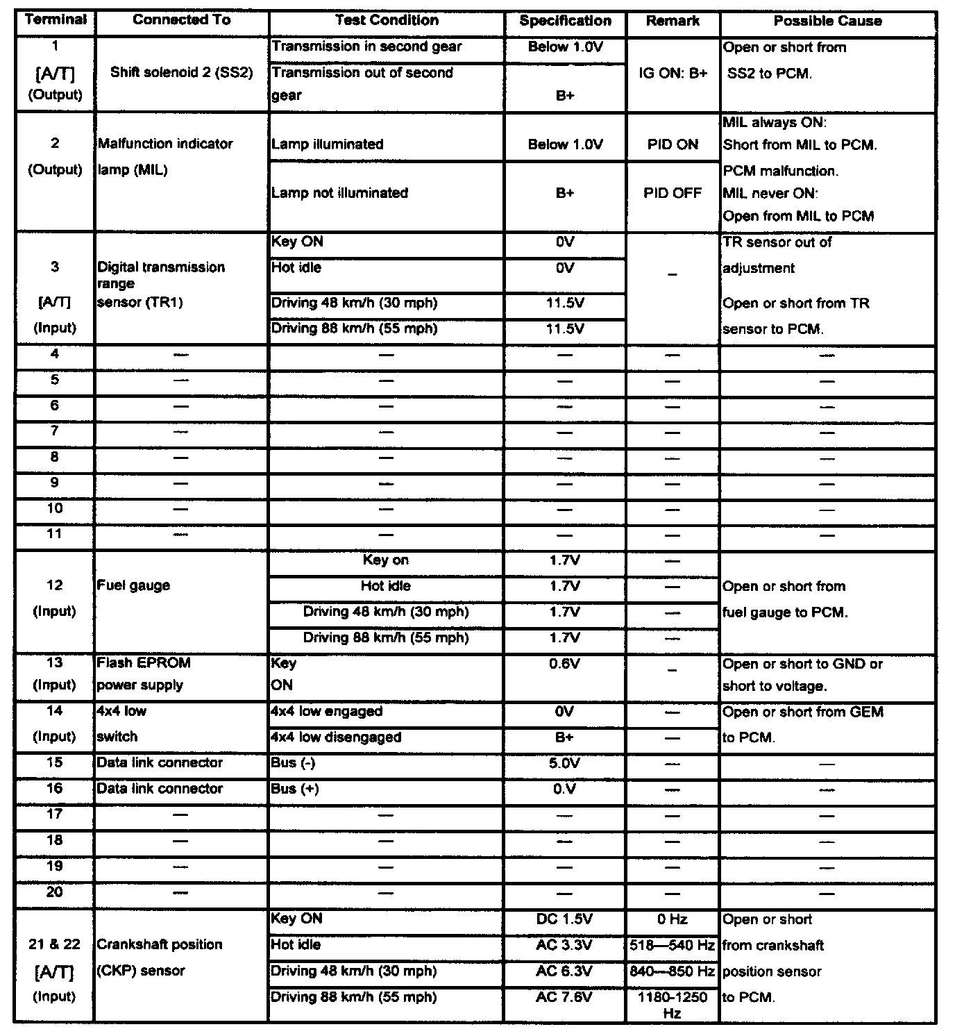 CAUTION:- The PCM terminal voltages vary with change in measuring conditions and vehicle conditions. Always carry out a total inspection of the input systems, output systems, and PCM to determine the cause of trouble. Otherwise, a wrong diagnosis will be made.