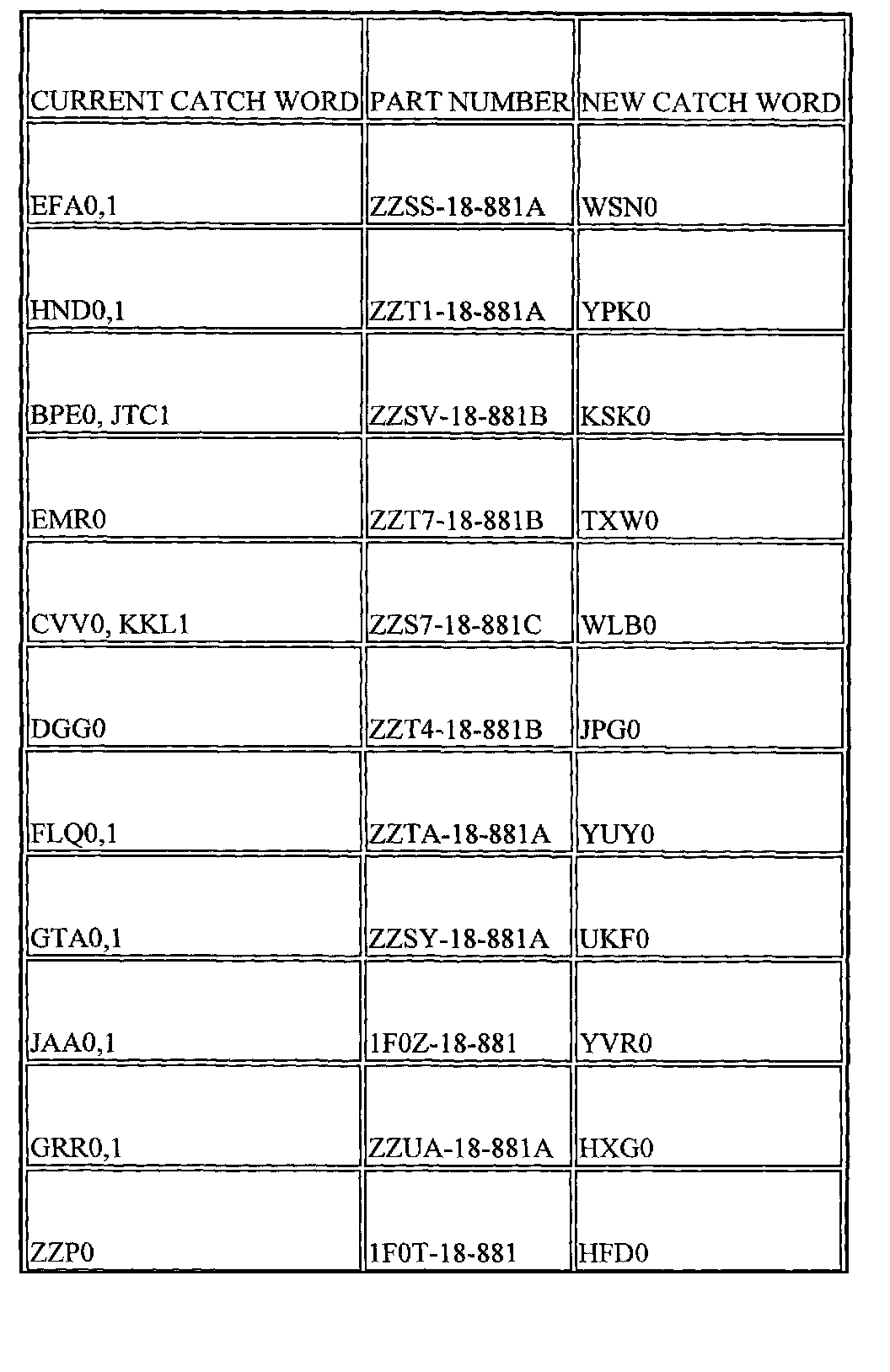 Locate "Catch Word" on vehicle firewall adjacent to PCM, or on the white tag on original PCM. Use the chart below to determine the correct PCM.