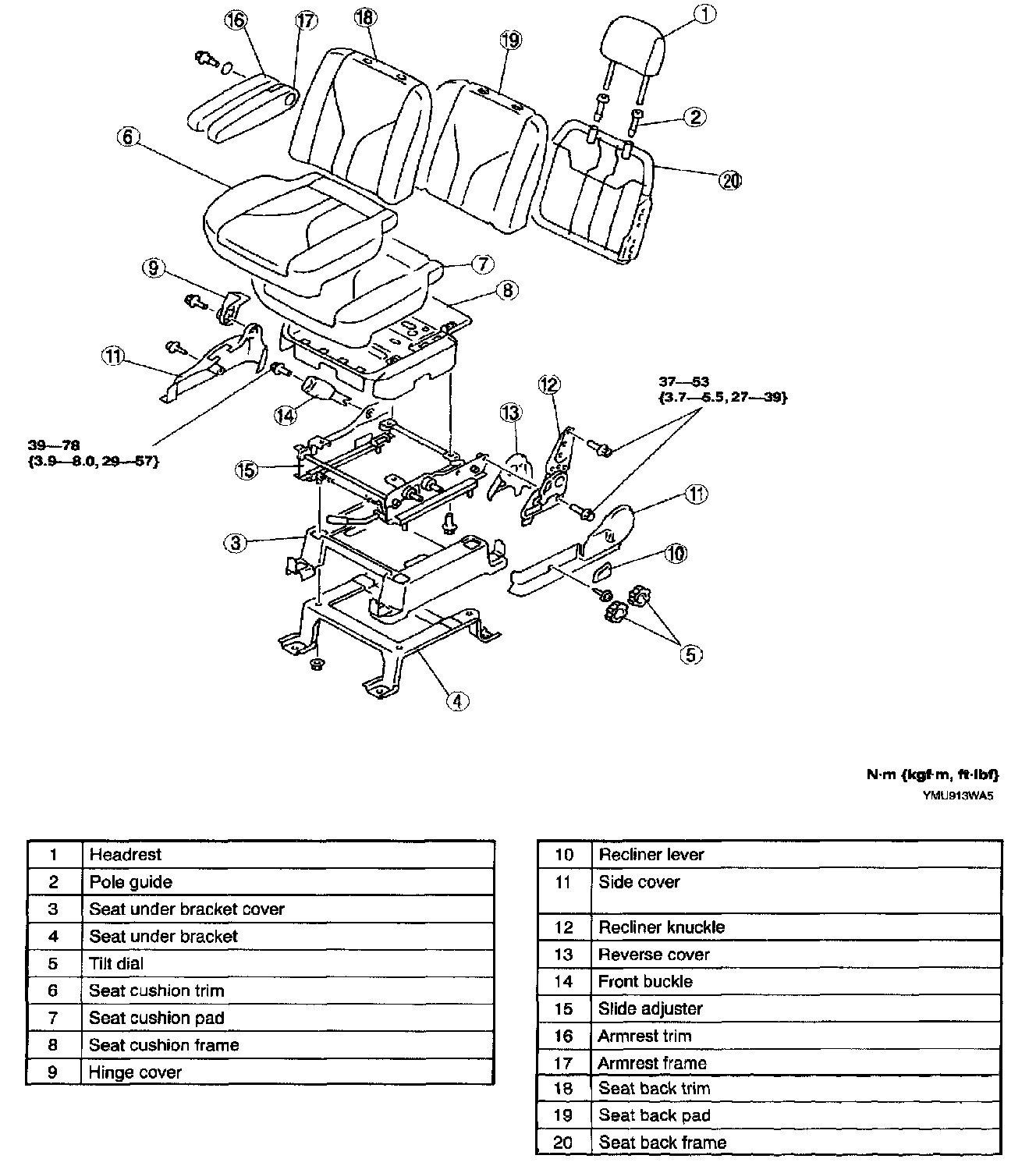 WARNING: Handling the front seat (side air bag) improperly can accidentally deploy the side air bag, which may seriously injure you. Read AIR BAG SYSTEM SERVICE WARNINGS before handling the front seat.