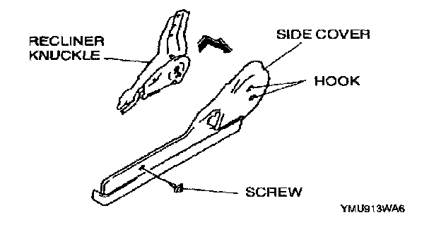 2. Lift the side cover up in the direction shown by the arrow, then unhook it from the recliner knuckle.