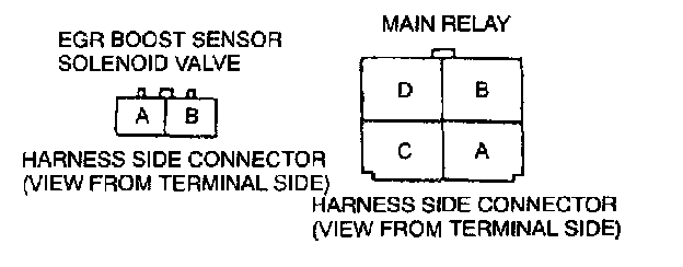 - EGR boost sensor solenoid valve terminal A (harness-side) and main relay terminal D (harness-side)