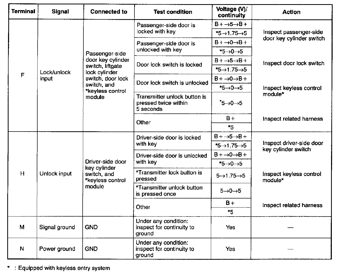 3. Disconnect the door lock control module connector before inspecting for continuity at terminals M, and N.