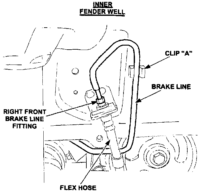 4. Disconnect the right front brake line fitting (use a 10 mm flare nut wrench) from the flex hose connection and unsnap the brake line from brake line clip "A".