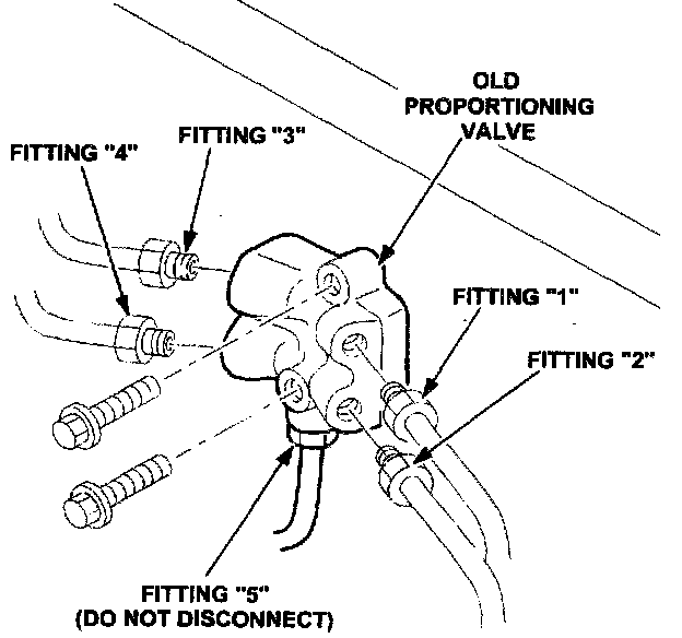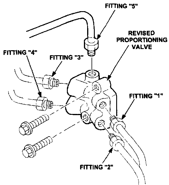 10. Disconnect brake line fittings "1", "2", "3", "4" from the proportioning valve, leaving fitting "5" connected.