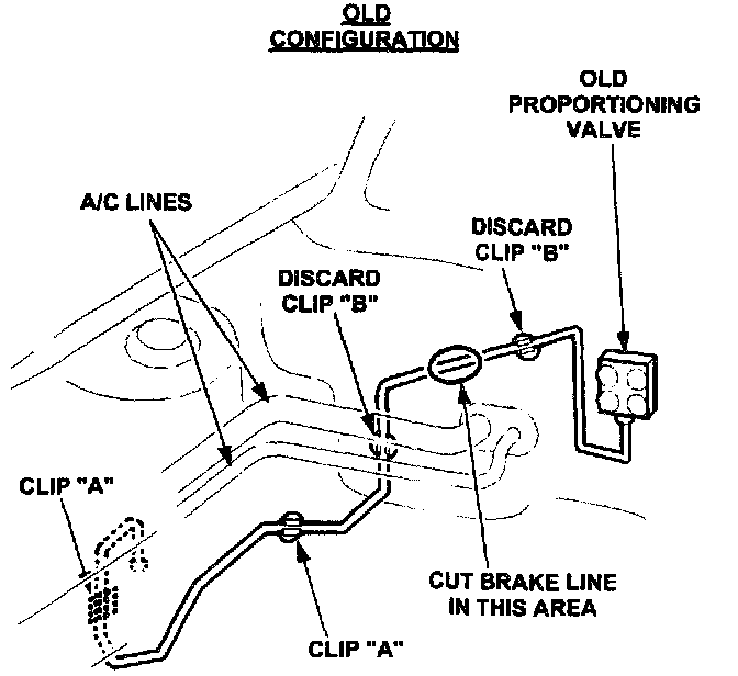 13. Cut the right front brake line at the bend allowing you to remove the brake line from the vehicle in two pieces. Discard the removed brake lines and proportioning valve.