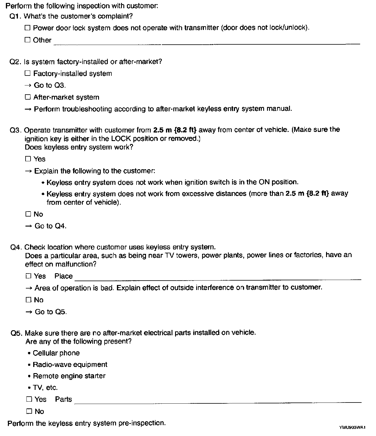 - If any of the following symptoms occur, find out how the customer uses the keyless entry system by following the check sheet shown.