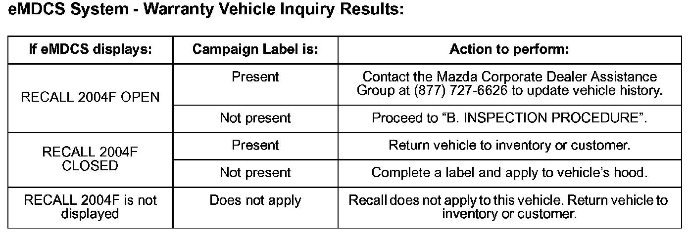 2. Perform a Warranty Vehicle Inquiry using your eMDCS System and inspect vehicle for an Authorized Modification Label Recall 2004F attached to the vehicle's hood. Refer to eMDCS System - Warranty Vehicle Inquiry Results table.