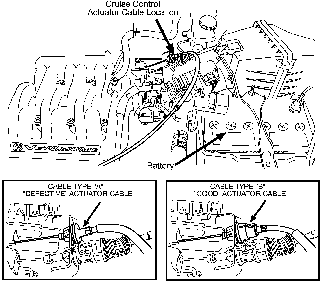 1. Identify the type of Cruise Control Actuator Cable installed on the vehicle by comparing the shape of Cable Type "A" and Cable Type "B" shown.