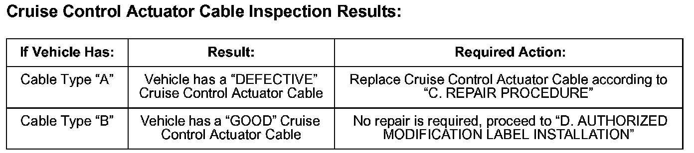 2. Use the "Cruise Control Actuator Cable Inspection Results" table shown to determine if any action is required.