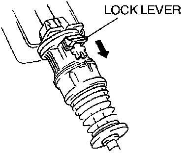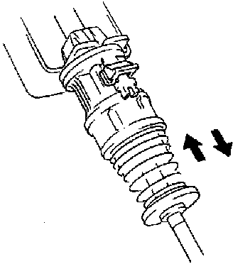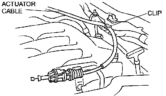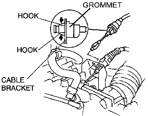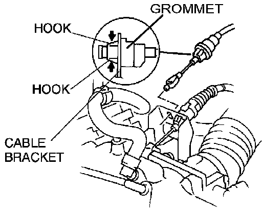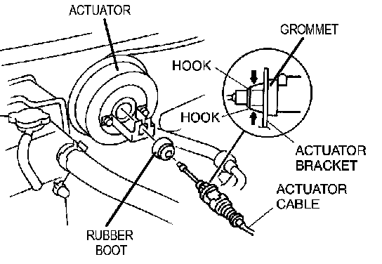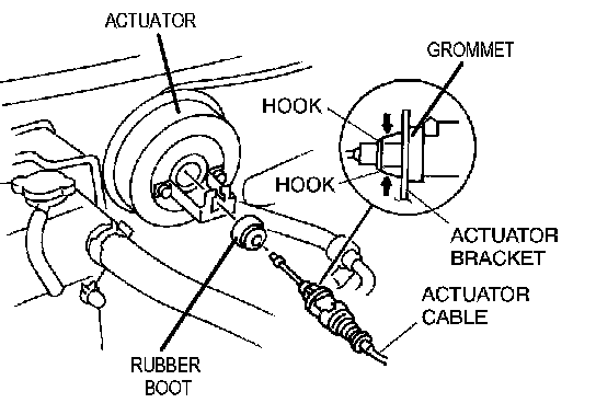 1. Squeeze the hooks of the grommet and remove the actuator cable from its bracket. Unhook the cable from the actuator.
