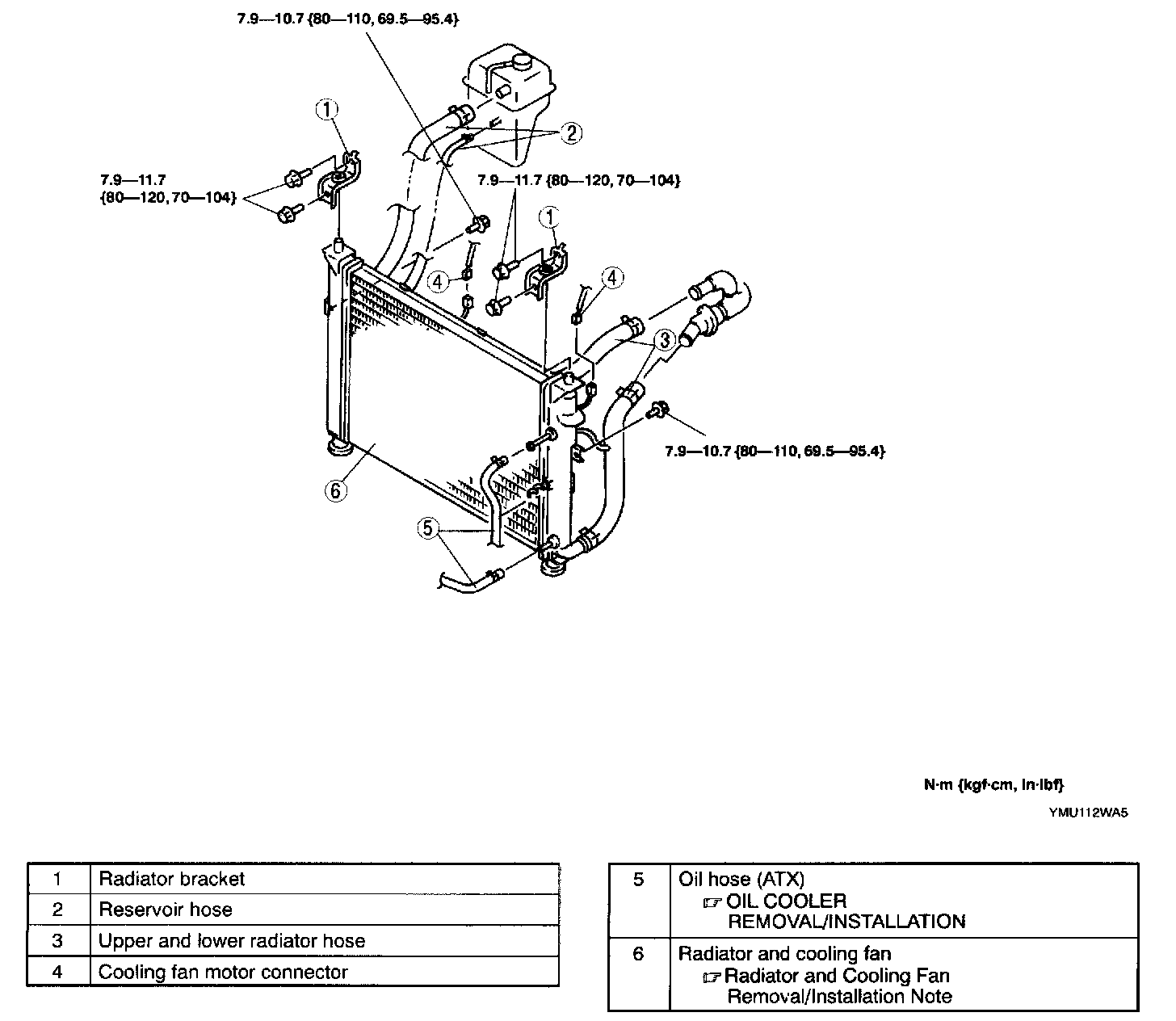 1. Pull the condenser forward to obtain clearance, and remove/install the radiator and cooling fan.