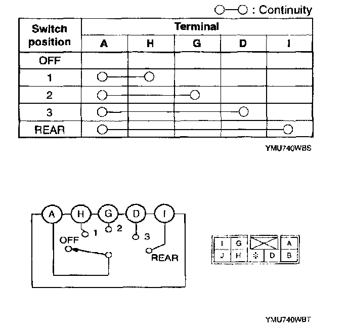 Inspect for continuity between the rear main fan switch terminals using an ohmmeter.