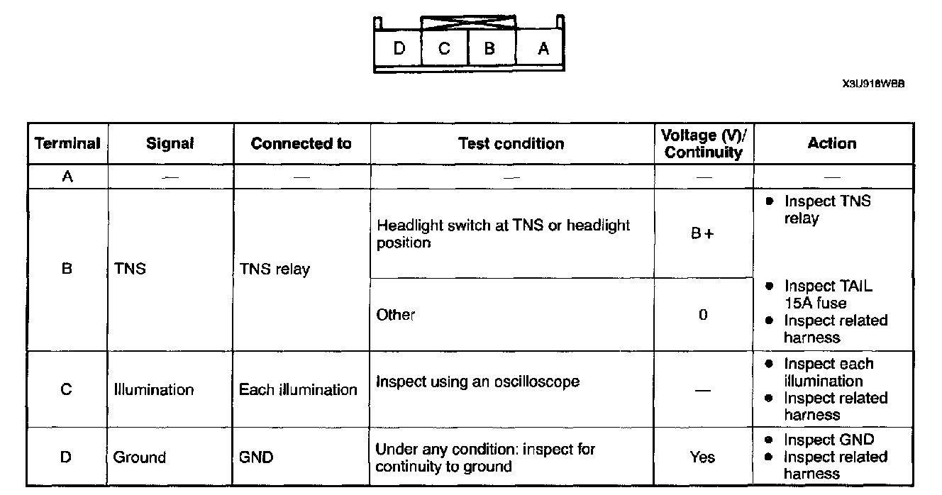 5. Disconnect the panel light control switch connector before inspecting for continuity at terminal D.