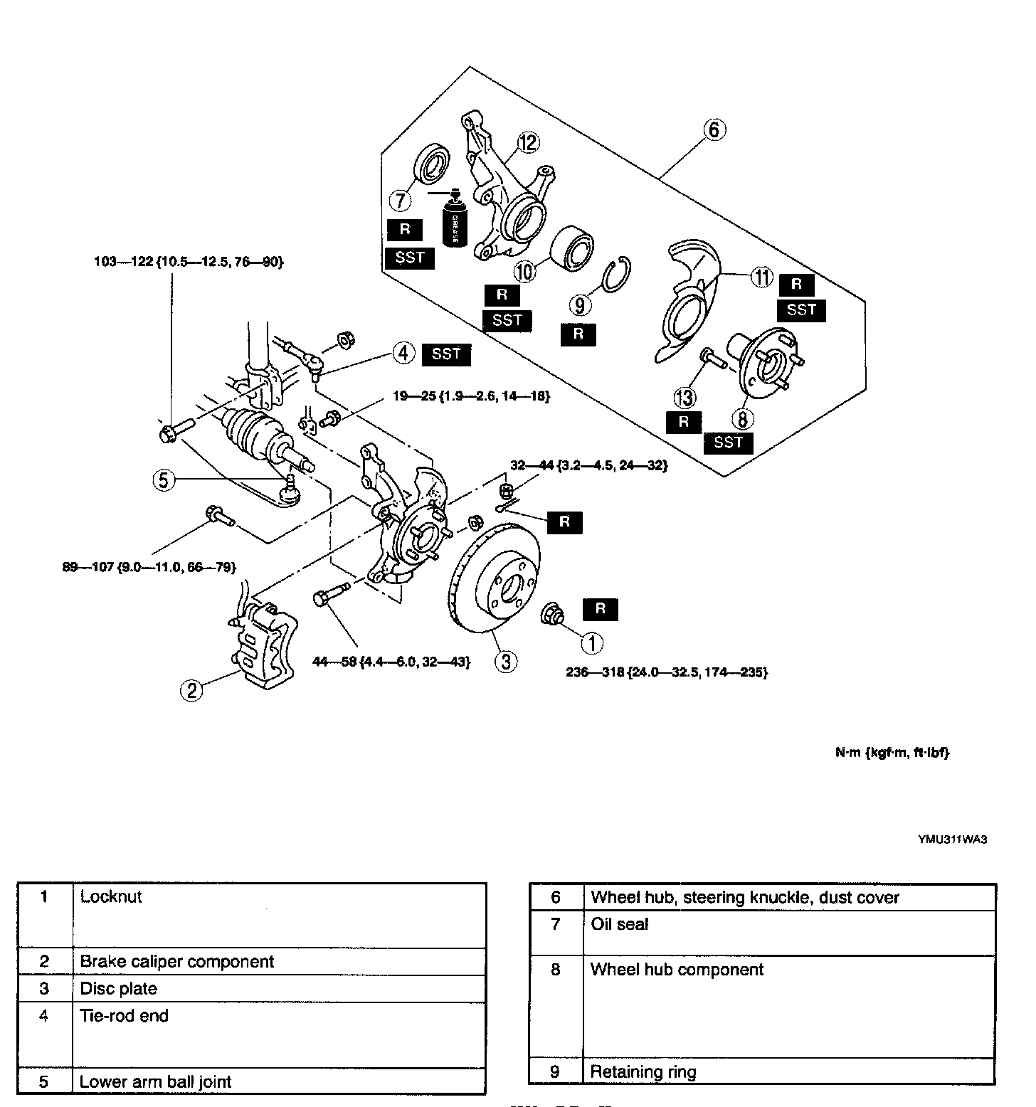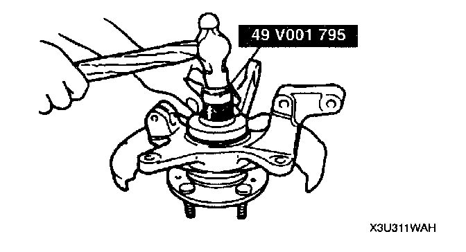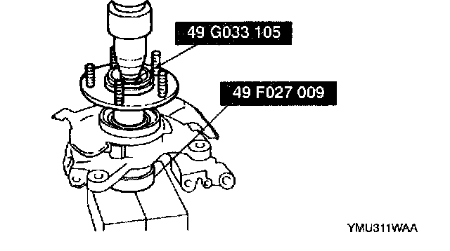 WHEEL HUB, STEERING KNUCKLE REMOVAL/INSTALLATIONCaution: Performing the following procedures without first removing the ABS wheel-speed sensor may possibly cause an open circuit in the harness if it is pulled by mistake. Before performing the following procedures, remove the ABS wheel-speed sensor (axle side) and fix it to an appropriate place where the sensor will not be pulled by mistake while servicing the vehicle.
