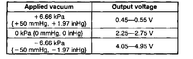 1. Decrease the applied pressure from +6.66 kPa {+50 mmHg, +1.97 inHg} to -6.66 kpa {-50 mmHg, -1.97 inHg} and verify that the PCM terminal 62 voltage decreases accordingly as specified.
