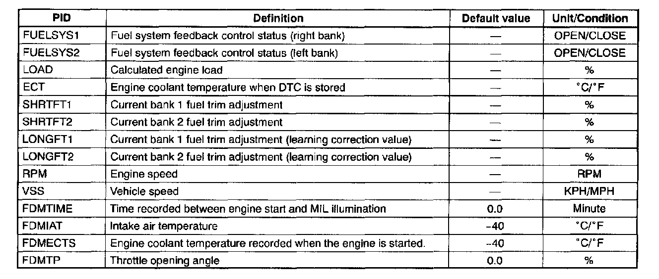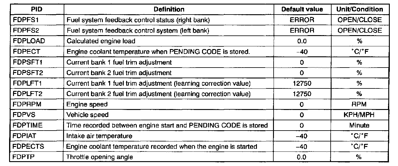 NOTE: FFD is a snapshot of the conditions that are present when DTC or PENDING CODE is stored. Once FFD is stored, this data will remain in PCM memory even if another emission related DTC or PENDING CODE is stored additionally, except for Misfire or Fuel System related DTC or PENDING CODE. Once Misfire or Fuel System related DTC or PENDING CODE is stored, it will overwrite any previous data and the FFD will not be further overwritten. When DTC associated with the FFD is erased or PCM is reset new FFD can be stored.