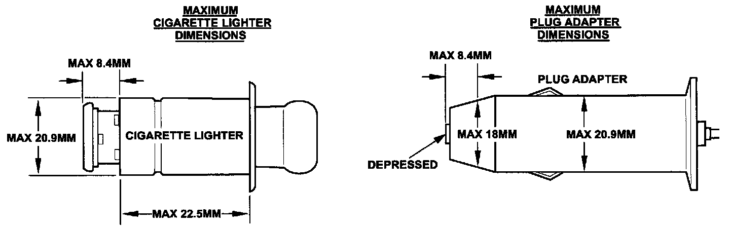 ^ Repairs are not covered by warranty if the concern was caused by a cigarette lighter or plug adapter not meeting the above dimensions.