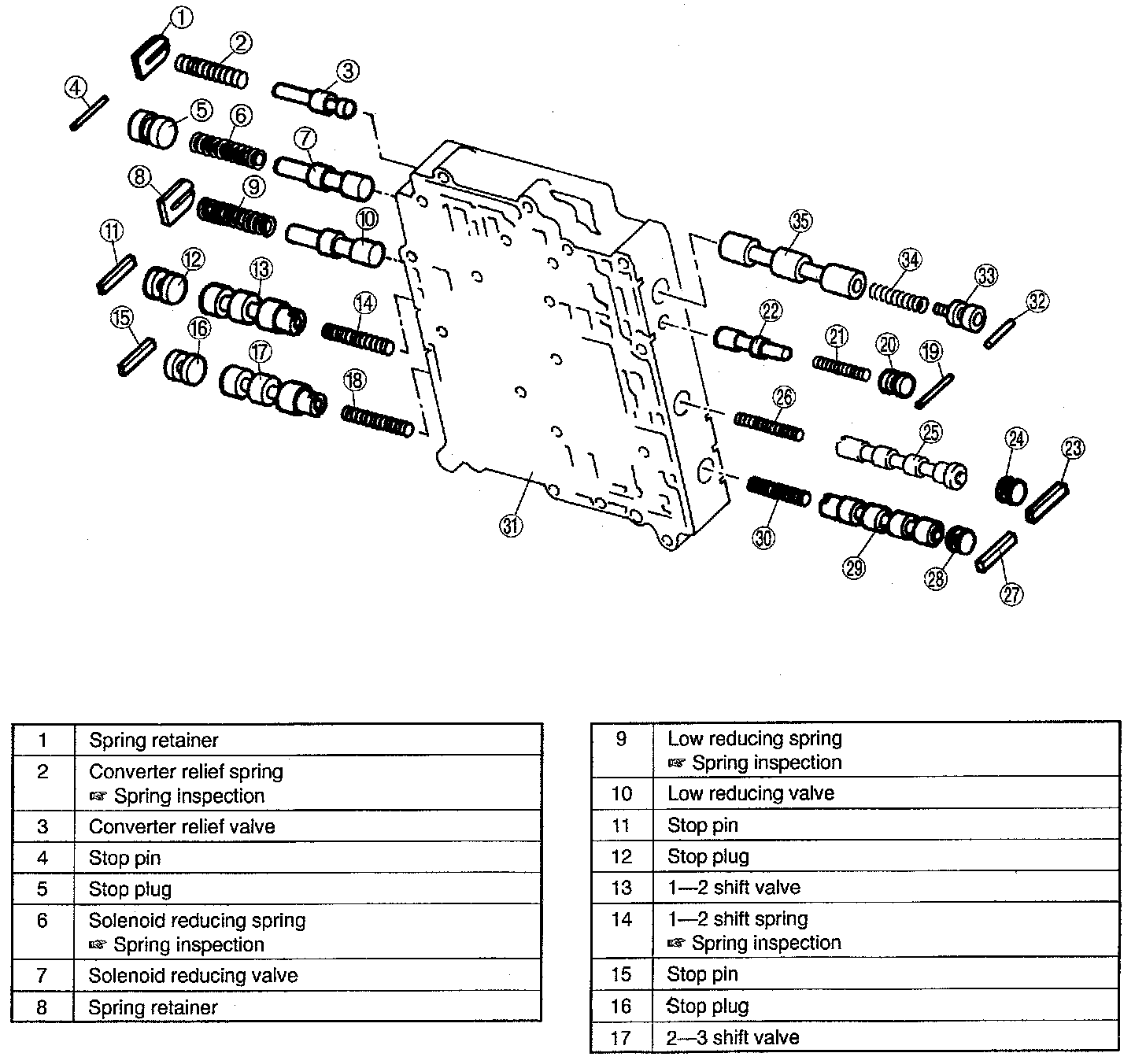 6. Install the 2-3 shift spring, 2-3 shift valve, stop plug, and stop pin.