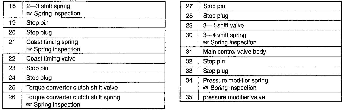MAIN CONTROL VALVE BODY DISASSEMBLY / INSPECTION / ASSEMBLYCAUTION: Denting or scratching these precisely machined components will reduce the ability of the transaxle to shift properly. When handling these components or the valve body that contains them, be careful not to drop or hit them.