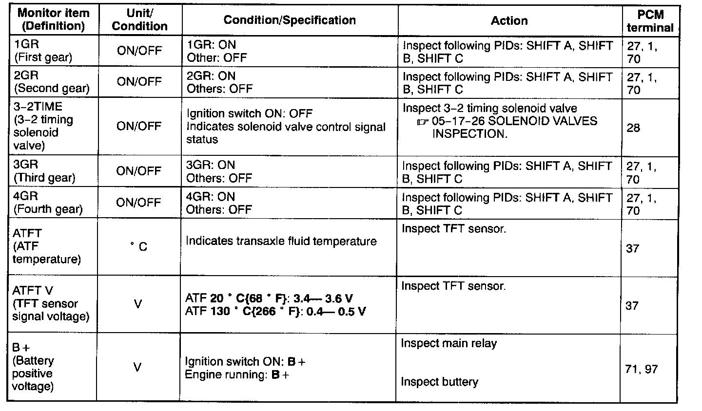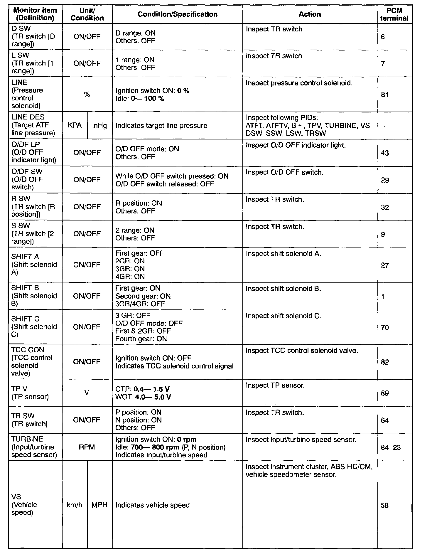 Note The PID/DATA MONITOR function monitors the calculated value of the input/output signals in the PCM. Therefore, if a monitored value of an output device is out of specification, it is necessary to inspect the monitored value of the input device related to the output device control. Since an output device malfunction is not directly indicated as a malfunction of the monitored value for the output device, it is necessary to inspect the output device individually using the simulation function, etc.