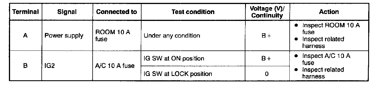 - If not as specified, inspect the parts listed under "Action" and the related wiring harnesses.
