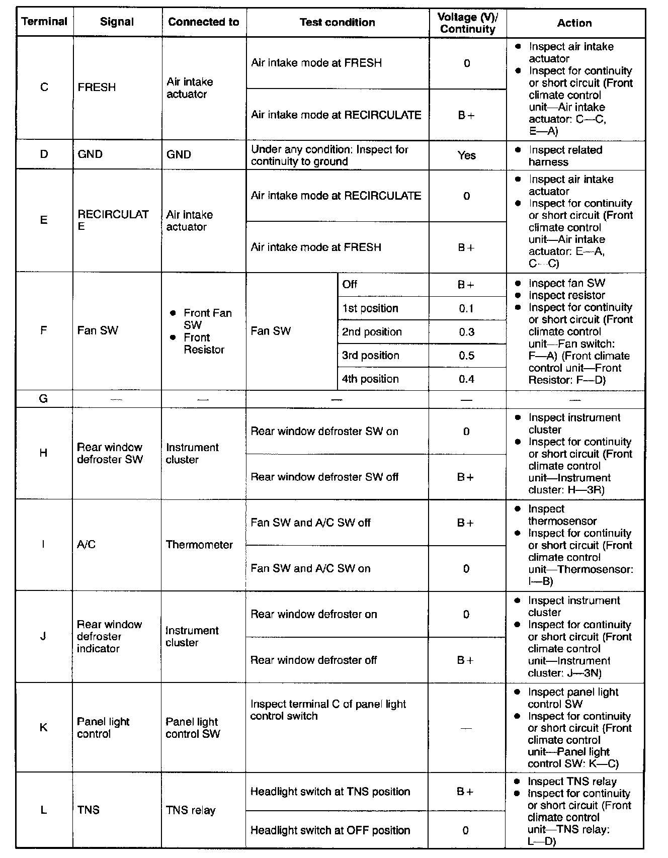 2. Measure the voltage at each front climate control unit terminal and refer to the terminal voltage list.