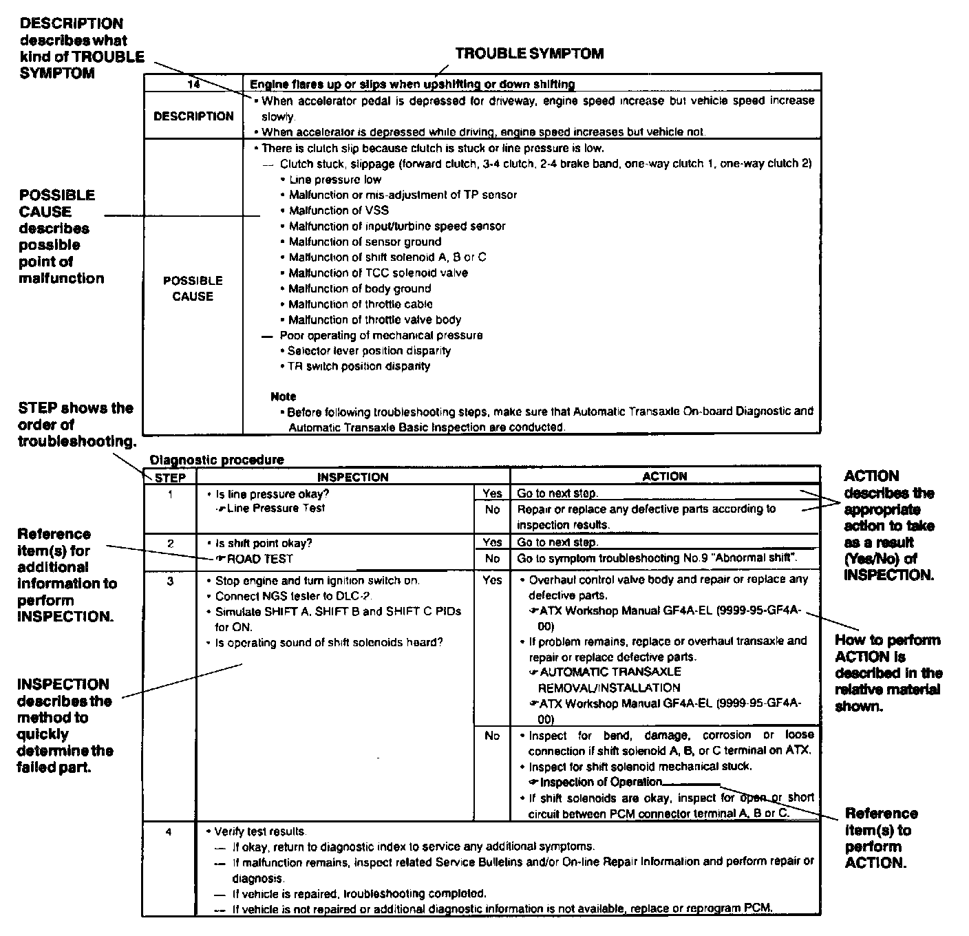 Symptom troubleshooting shows diagnostic procedures, inspection methods, and proper action to take for each trouble symptom
