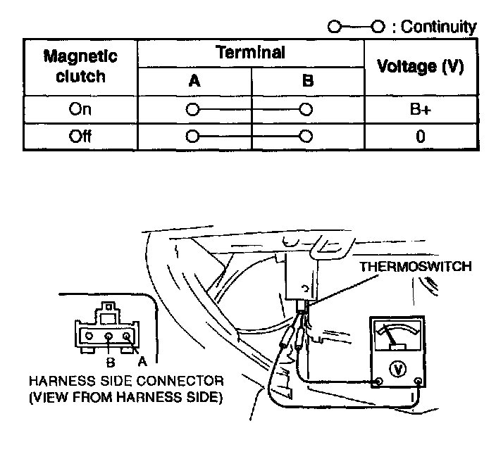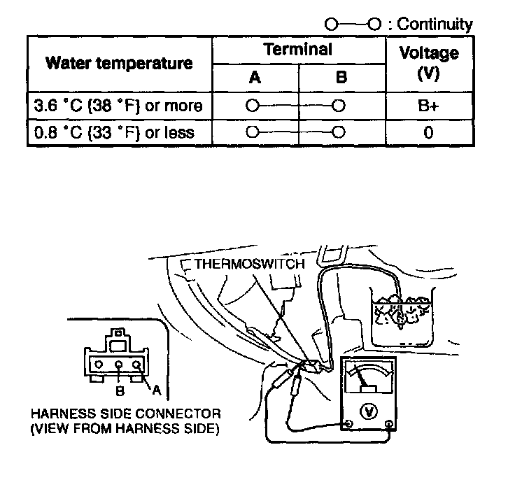 5. Connect the positive (+) and negative (-) probes of the voltmeter to terminal A and terminal B of the thermoswitch respectively. (The wiring harness connector must be connected to the thermoswitch connector.)