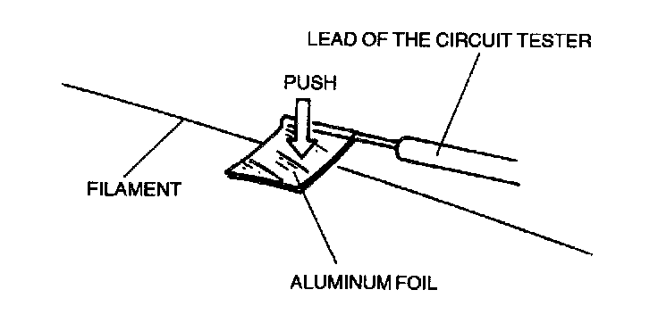 CAUTION: Directly touching the rear window defroster filament with the lead of the circuit tester will damage it. Wrap aluminum foil around the end of the lead and test the filament by touching it with the foil.