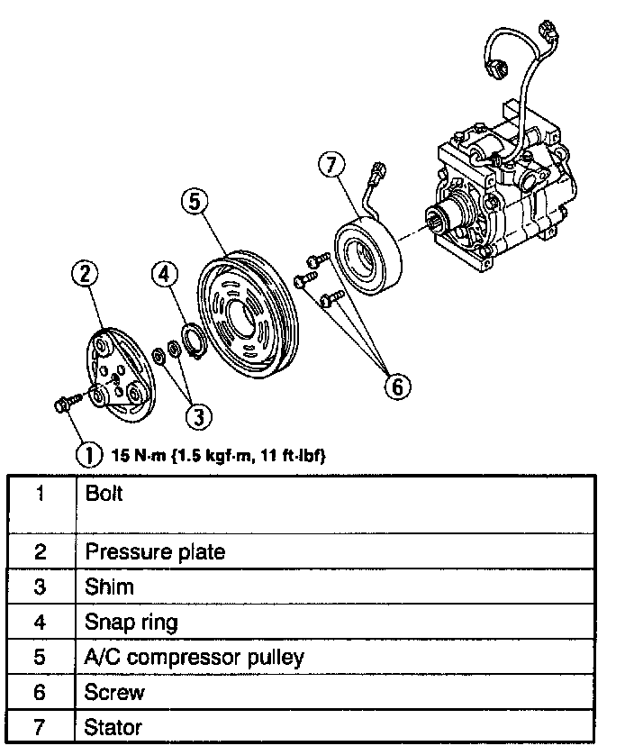 1. Remove the A/C compressor.2. Disassemble in the order indicated in the table.