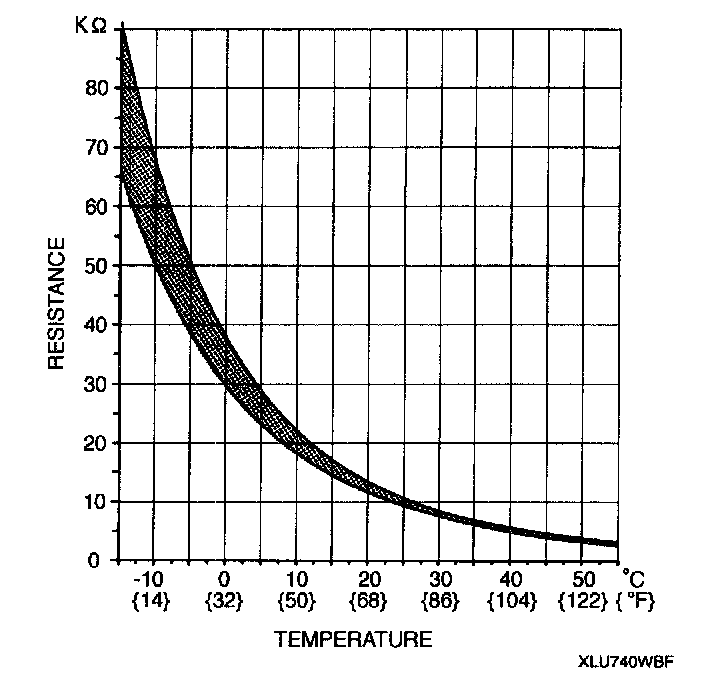 - If the resistance is not in the shaded zone indicated in the graph, replace the water temperature sensor.