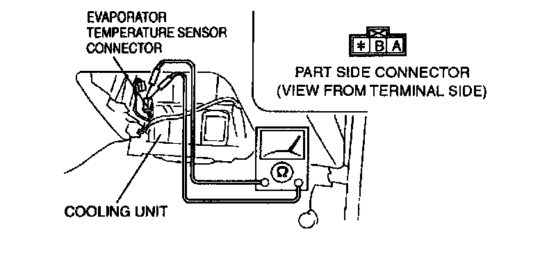 7. Measure the resistance between terminals A and B of the evaporator temperature sensor connector (male).