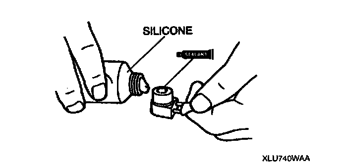 Apply approximately 1 g {0.04 oz} of silicone (Shin-Etsu Silicone KE-347W or similar) to the contact surface of the thermal protector, then thoroughly install onto the A/C compressor, leaving no gaps.