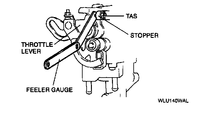 4. Insert a 0.50 mm {0.020 in} feeler gauge between the throttle adjusting screw (TAS) and the throttle lever. Verify that there is no continuity.