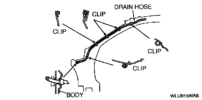 1. Insert one end of the hose into the sunroof frame. Insert the other end into the rear fender panel hole via the hole in the upper part of the C-pillar.