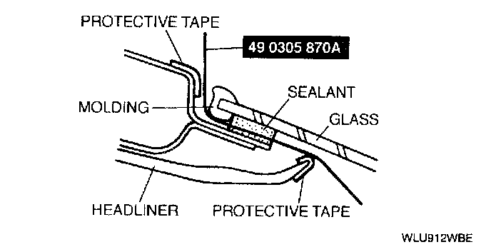 5. Apply primer to the bonding area of the molding, glass, and body using a brush. Use only glass primer on the glass, and body primer on the body and molding. Keep the area free of dirt and grease, and do not touch the surface. Allow it to dry for approximately 30 minutes.