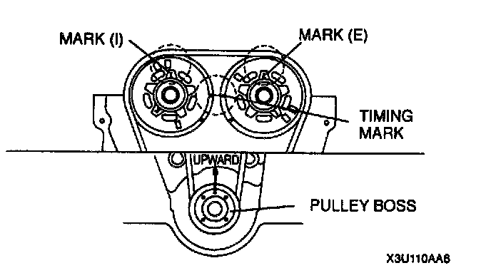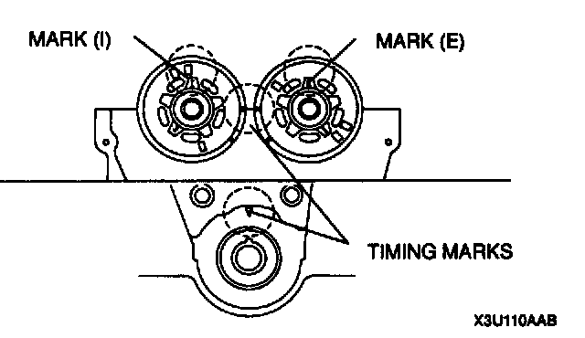 Note: Face the "I" and "E" marks on the camshaft pulley straight up and align the timing marks with the cylinder head upper surface.