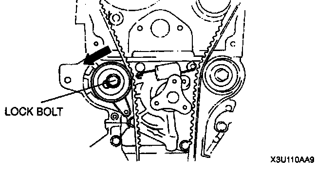 4. Loosen the tensioner lock bolt to apply tension to the timing belt. Do not apply tension other than that of the tensioner spring.