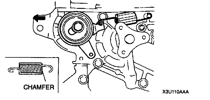 1. Install the tensioner spring so that the chamfer of dumping rubber faces the right side as shown.