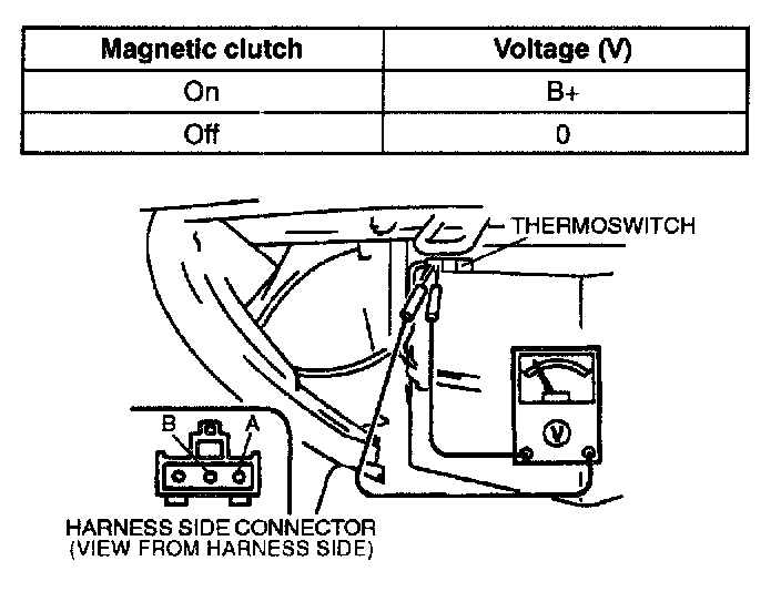 5. Connect the positive (+) and negative (-) probes of the voltmeter to terminal A and terminal B of the thermoswitch respectively. (The wiring harness connector must be connected to the thermoswitch connector.)