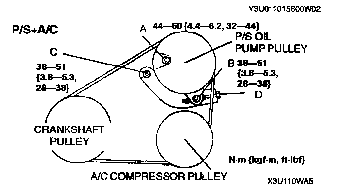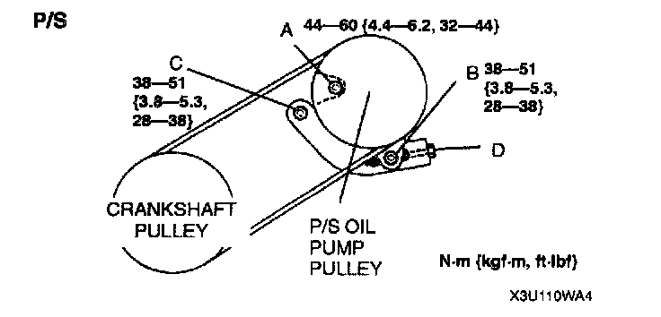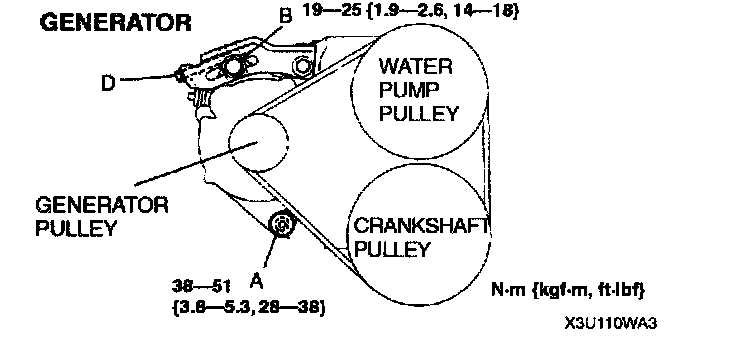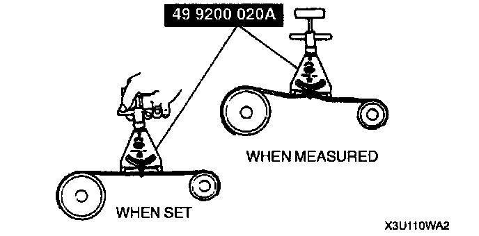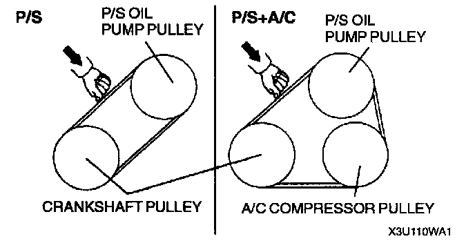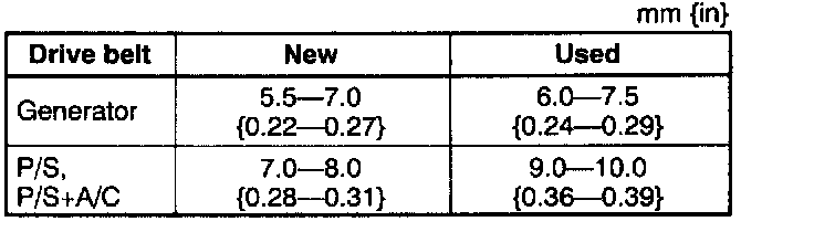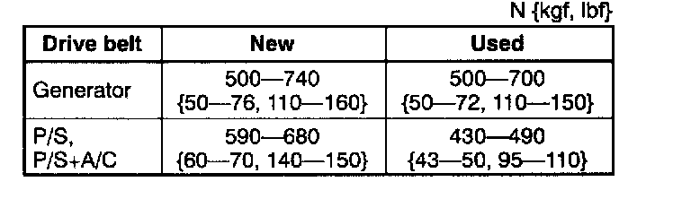 - If the belt is replaced with a new one or the belt has been on a running engine for less than 5 minutes, adjust deflection or tension to "New" specification. Then warm up the engine, allow it to cool, and adjust deflection or tension to "Used" specification.