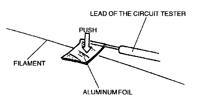 CAUTION: Directly touching the rear window defroster filament with the lead of the circuit tester will damage it. Wrap aluminum foil around the end of the lead and test the filament by touching it with the foil.