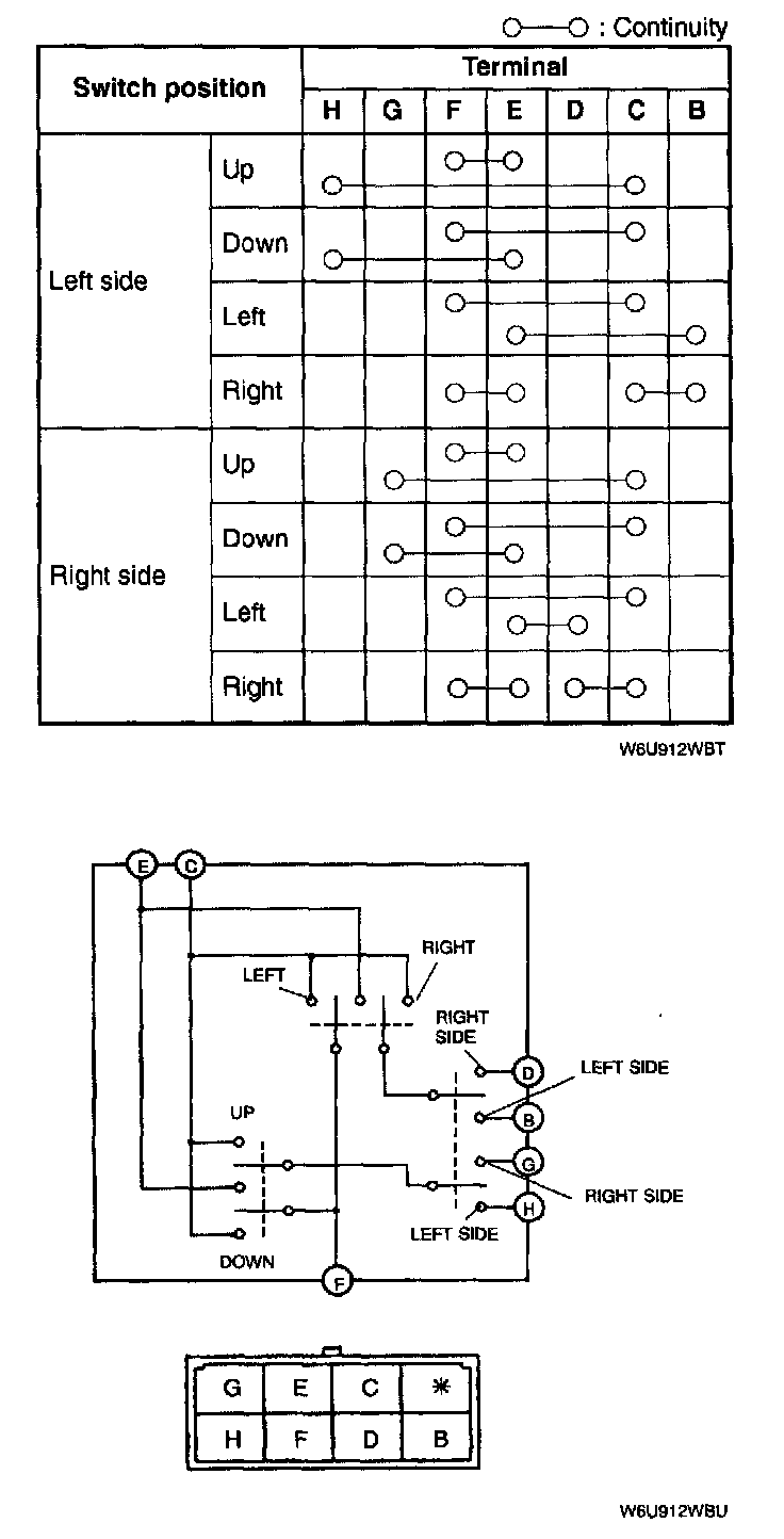 2. Inspect for continuity between the power outside mirror switch terminals by using an ohmmeter.