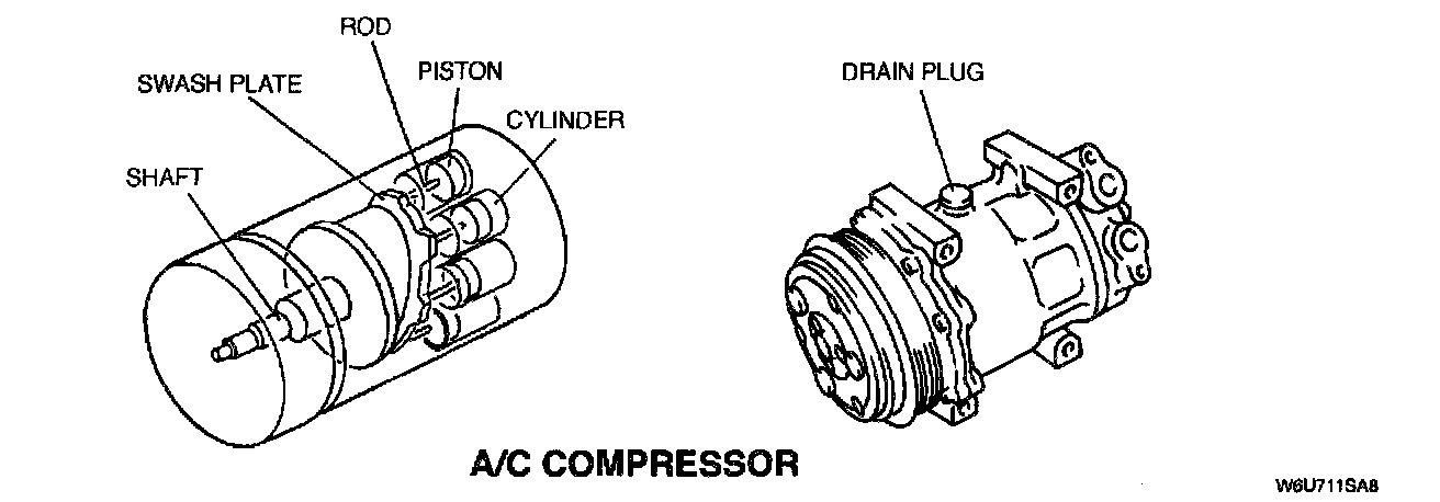 A/C Compressor Description- The A/C compressor is a swash plate type that has 7 cylinders. This A/C compressor has the advantages of low power consumption and improved performance at low speeds.