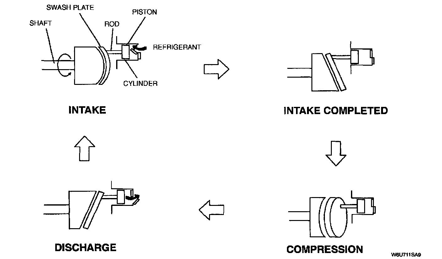 - The A/C compressor consists mainly of a shaft, a swash plate, seven rods, and seven pistons.