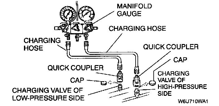1. Fully close the valves of the manifold gauge.2. Connect the charging hoses to the high- and low-pressure side joints of the manifold gauge.
